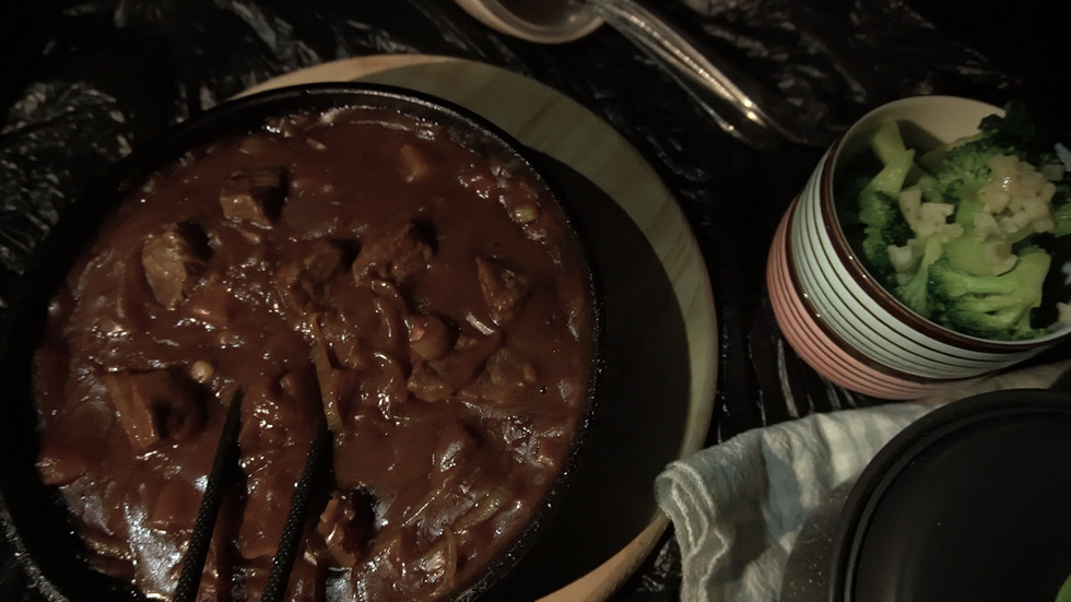 这是我们的晚餐,有白饭、西兰花和咖哩牛肉。