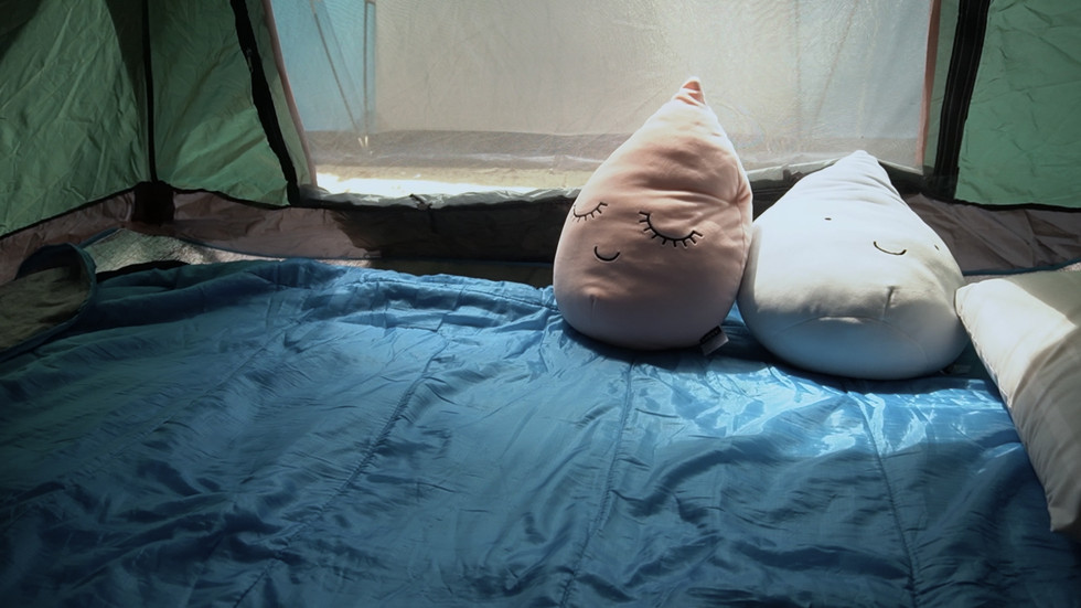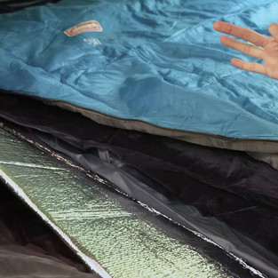 地板第一层是防潮垫,第二层是充气床,第三层是睡袋。很可惜我们忘了带充气床的塞子!